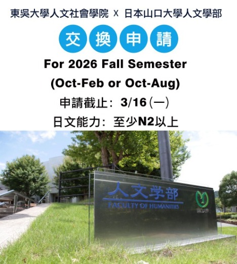 公告東吳大學人文社會學院與日本山口大學人文學部 學生交流協議與招生資訊,歡迎學生踴躍提出申請