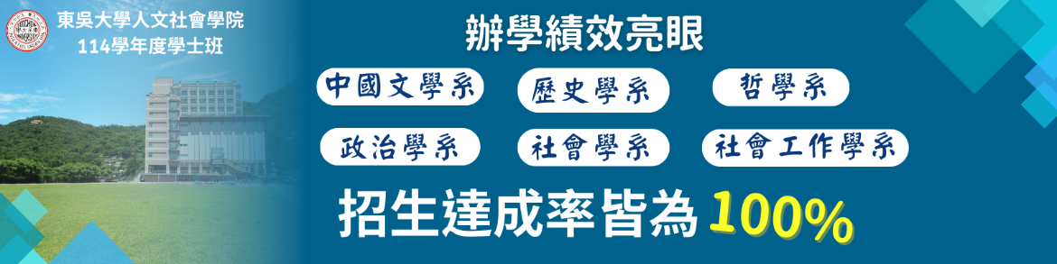 #中國文學系 #歷史學系 #哲學系 #政治學系 #社會學系 #社會工作學系 招生達成率皆為100% #辦學績效卓越 #成果有目共睹 #可喜可賀 校園頭條 |https://news.scu.edu.tw/news/71537 中央社訊息 |https://www.cna.com.tw/postwrite/Chi/409622