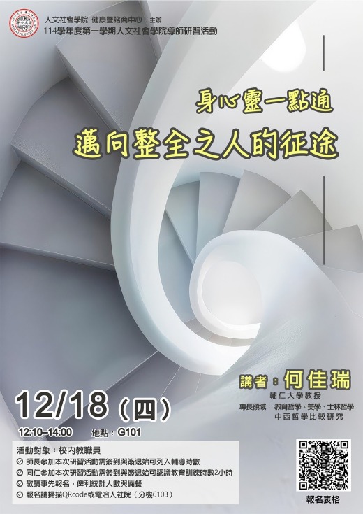 人社院於本學期結合健康暨諮商中心定期舉辦的導師研習活動,特別邀請輔仁大學何佳瑞教授主講「身心靈一點通:邁向整全之人的征途」,藉由其豐富的生命教育經驗,提升教師在生命教育、學生輔導與全人關懷的理解與實踐,誠摯邀請師長、同仁共襄盛舉,攜手提升老師輔導支持力。