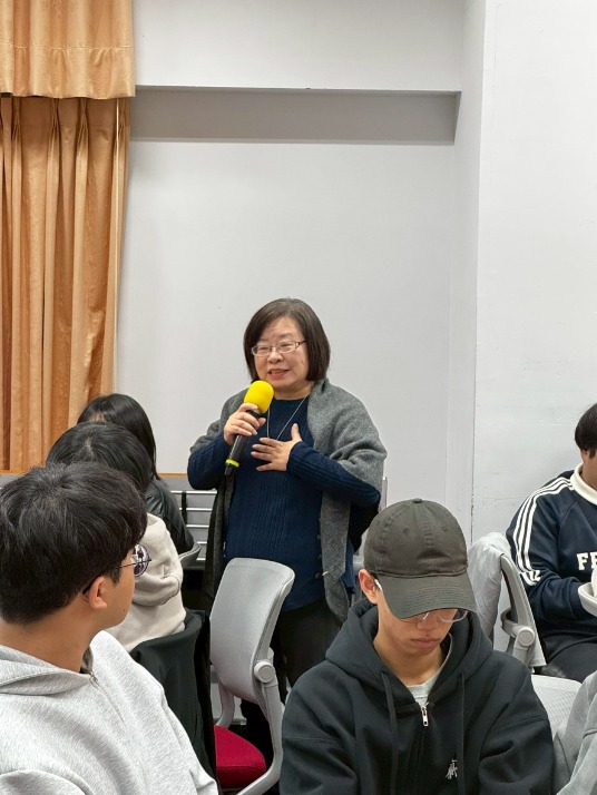 直到活動尾聲,叢老師才揭曉這位神秘嘉賓的身分——原來是游喬茵老師。游老師曾在本校教授華語學程的「華語口語與表達」課程。她對學生們當天的表現深感驚艷,並提醒同學們,將聆聽到的內容轉化為文字,是未來極為重要的能力。