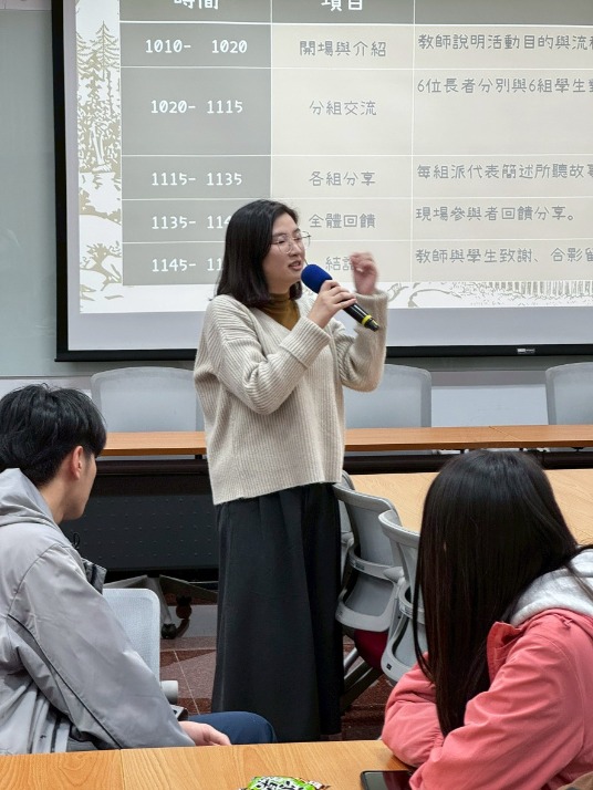 為落實社會實踐精神,並呼應國文課程「口語表達」的目標,人文社會學院「Meta外雙溪」 USR計畫於11月20日,邀請翠山里慈光堂及溪山社區發展協會,一共六位長者進入大一國文課堂,與學生分組交流。活動由團隊成員中文系叢培凱老師統籌規劃。