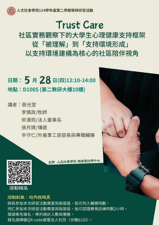 ※講題:Trust Care–社區實務觀察下的大學生心理健康支持框架--從「被理解」到「支持環境形成」--以支持環境建構為核心的社區陪伴視角
