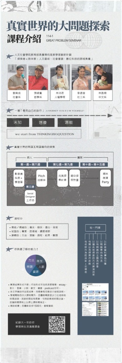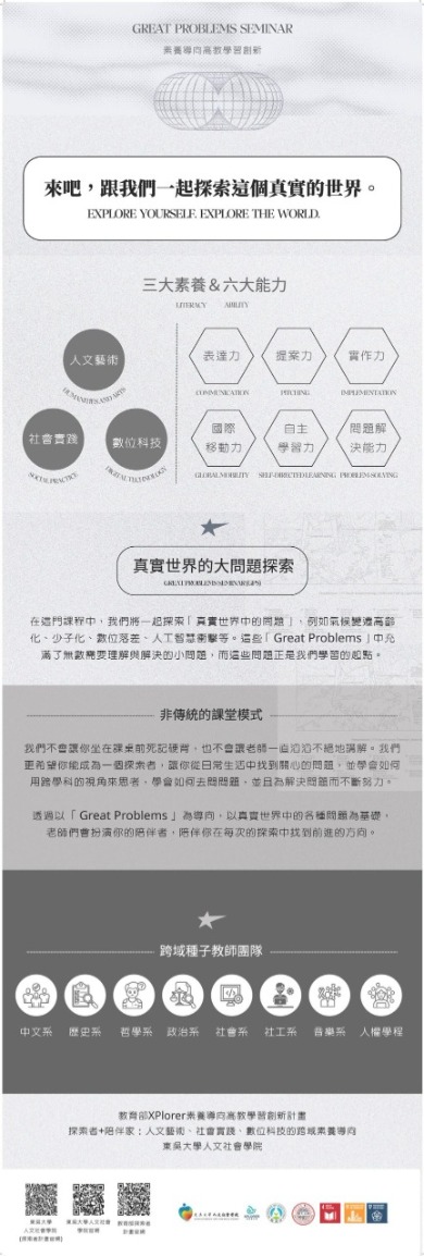 三、整合學院所屬七個學系(中國文學系、歷史學系、哲學系、政治學系、社會學系、社會工作學系、以及音樂學系),以大一新生為規劃對象。